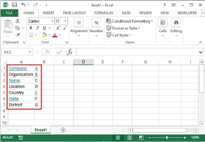 步驟1 - 下面顯示了一個示例工作表,其中包含散佈的超連結。