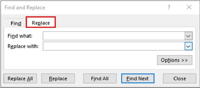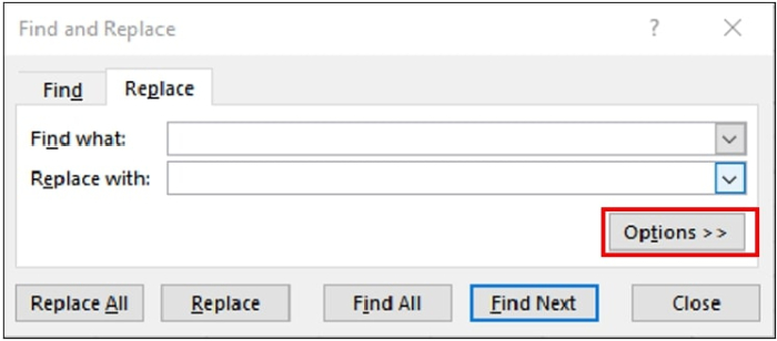 步驟3 - 在“查詢和替換”對話方塊上,單擊選項。