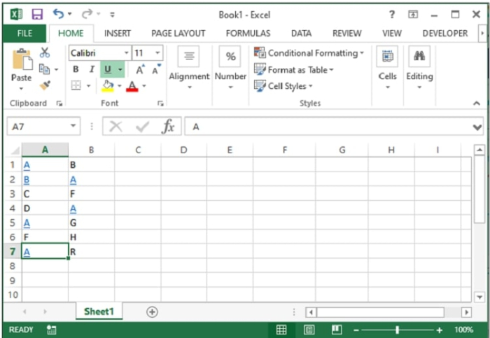 步驟1 - 顯示一個示例工作表,其中包含一些類似的超連結單元格值。