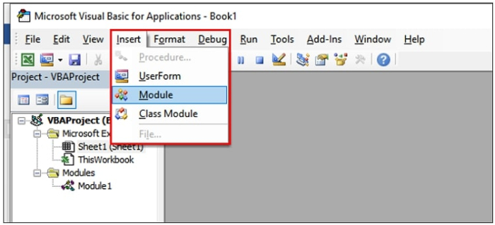 步驟2 - 在Microsoft Visual Basic for Applications視窗中,轉到插入>模組。