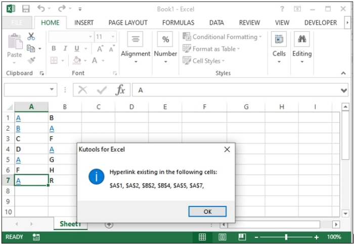 Sub HyperlinkCells() \ A VBA function used to jump to a location of a worksheet where hyperlinks are available Dim xAdd As String \ Adding a variable xAdd as string type Dim xTxt As String \ Adding a variable as xText as string type Dim xCell As Range \ Adding a variable xCell as Range type Dim xRg As Range \ Adding a variable as xRg as range type. On Error Resume Next \ when a run-time error occurs, go to the statement immediately following the statement where the error occurred and execute next. xTxt = ActiveWindow.RangeSelection.AddressLocal \ Returns a Range object that represents the selected cells on the worksheet in the active window Set xRg = Application.InputBox("Please select range:", "Kutools for Excel", xTxt, , , , , 8) \ A popup message box to display range of cells If xRg Is Nothing Then Exit Sub \ If no hyperlink is found then exit from the sub statement For Each xCell In xRg \ Condition For each xCell variable in the range If xCell.Hyperlinks.Count > 0 Then xAdd = xAdd & xCell.AddressLocal & ", " \ Condition to count the hyperlinked cells in the active sheet Next If xAdd <> "" Then \ If the value of xAdd is Not Equal to firstAddress then execute the next statement. MsgBox "Hyperlink existing in the following cells: " & vbCrLf & vbCrLf & Left(xAdd, Len(xAdd) - 1), vbInformation, "Kutools for Excel" \ Display a msg box with all hyperlinked cell addresses.) End If \ end if condition End Sub \ end sub statement