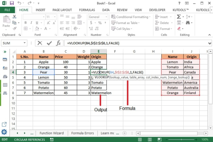 在公式中,B2是您要檢查是否與另一個列表匹配的列表的第一個單元格,I2:J7是您要基於其進行檢查的第二個列表。