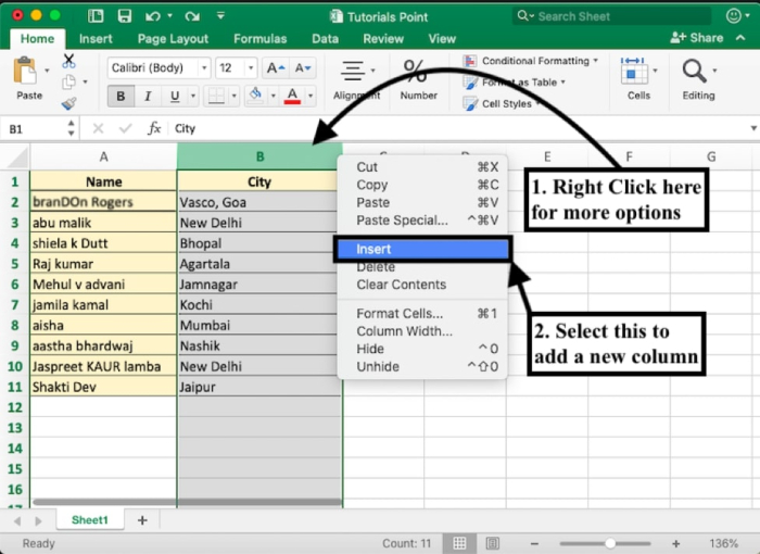 步驟1 - 在列的旁邊建立一個包含要轉換文字的臨時列。透過右鍵單擊列B標題並選擇“插入”來將其放在列A和B之間。