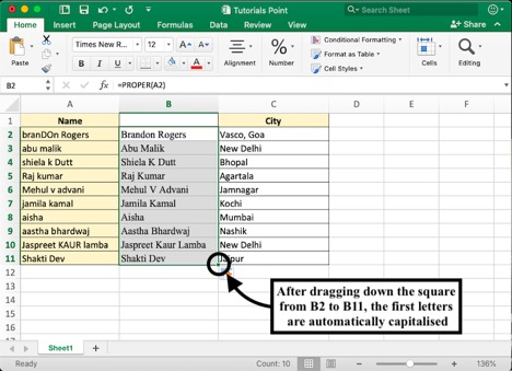 步驟4 - 您可以透過簡單地從B2向下拖動到B11來一次性將單元格A3到A11中的其餘姓名大寫。