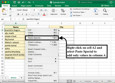 從右鍵單擊選單中選擇“選擇性貼上”,然後從下拉選單中選擇“數值”。此步驟的目的是僅貼上名稱而無需底層公式,以便消除任何錯誤。完成此步驟後,您可以刪除臨時列。