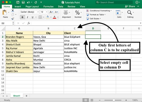 步驟1 - 選擇或插入要大寫首字母的列旁邊的臨時列。在本例中,列D用於列C中的值。