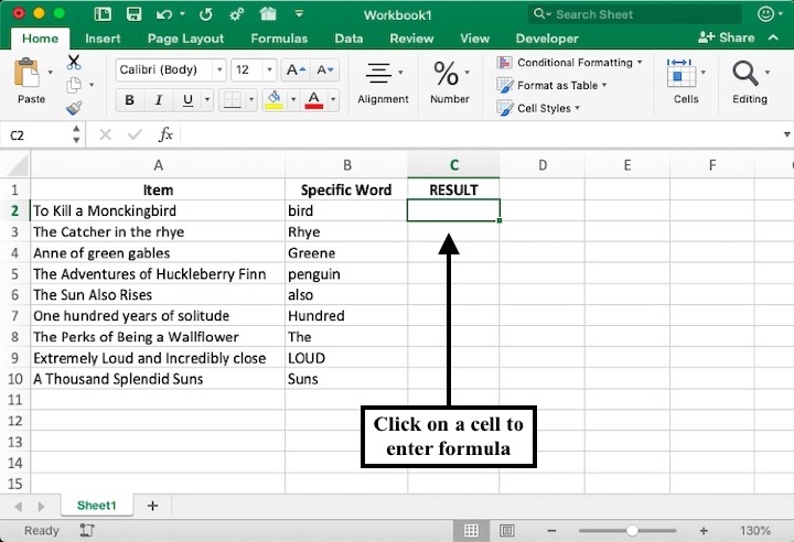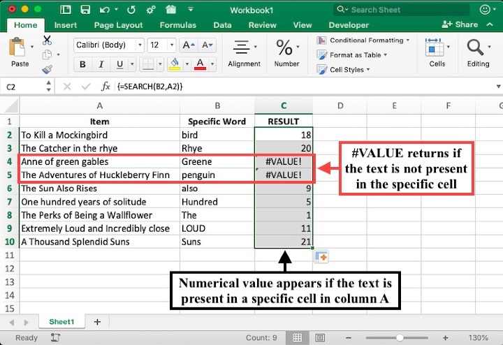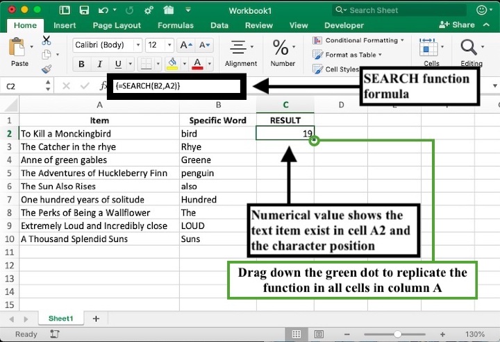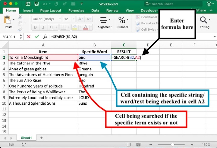 藉助 Excel 中內建的 SEARCH 函式,您可以在文字字串中查詢特定子字串。在下面的示例中,列 A 中列出了書籍列表,並且想要檢查特定單詞或文字是否存在於相應的單元格中。請按照以下步驟學習如何使用 SEARCH 函式查詢單元格是否包含特定單詞。