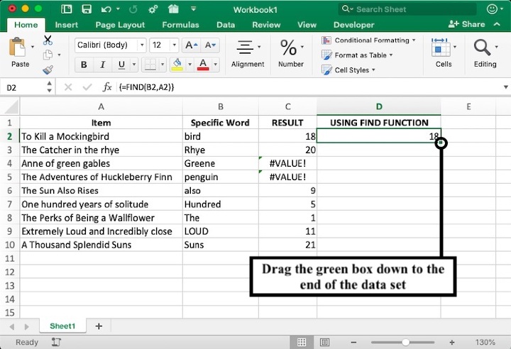 步驟 4:要將 SEARCH 函式複製到表中其餘的值,請選擇並向下拖動公式單元格右下角的綠色方框。