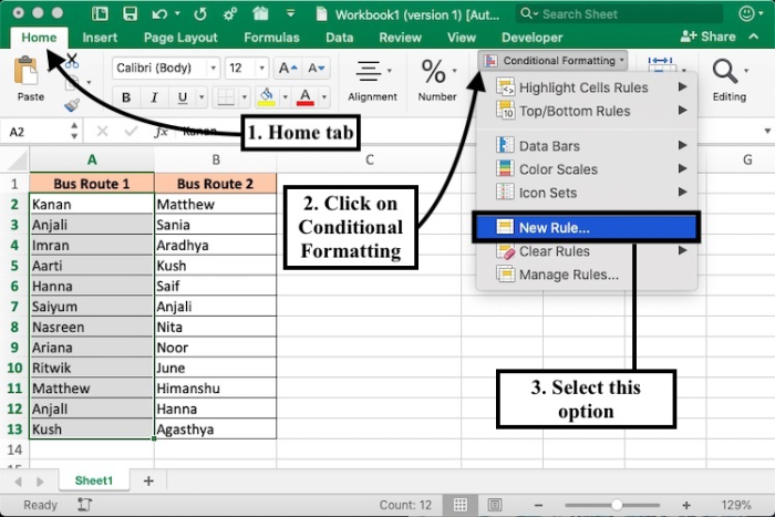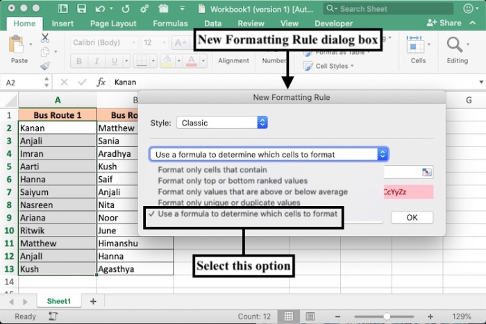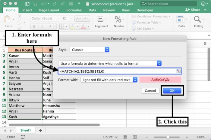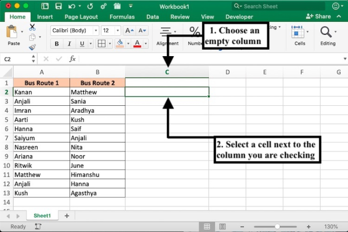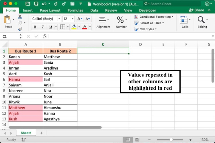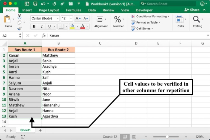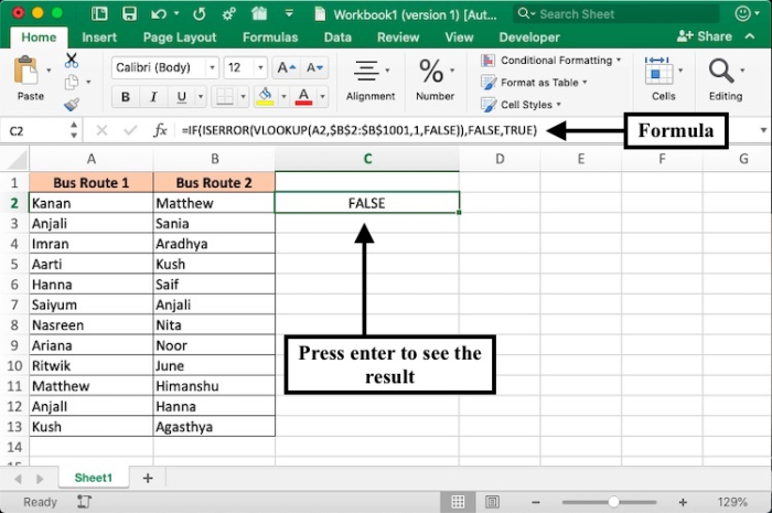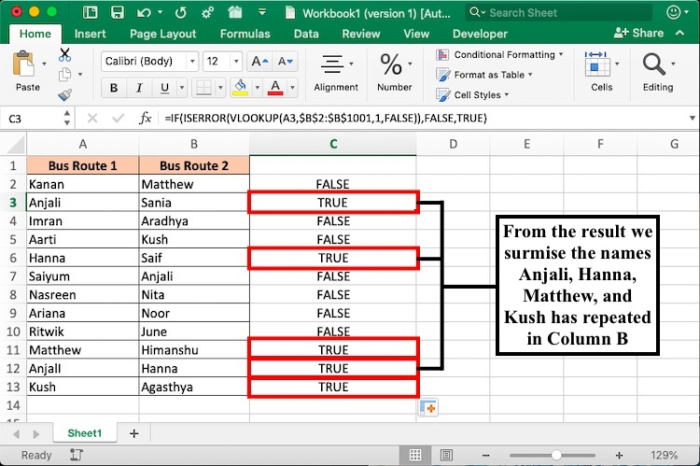 如示例電子表格所示,兩列包含公交路線和乘客姓名,並且兩者都無法同時存在。為了糾正此錯誤,我們使用 VLOOKUP 函式檢查列 A 中的姓名是否在列 B 中重複。