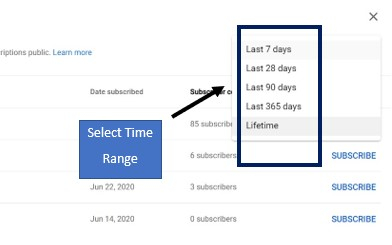 還可以按日期範圍進行排序。在頂部,可以檢視過去七天、一個月、90 天、一年或頻道生命週期內誰訂閱了。點選表格右上角的下拉選單以更改時間選擇。在下面的示例中,我們可以看到終身訂閱者。