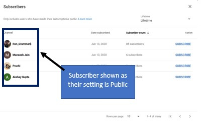 如果訂閱者已將其個人資料設定為私密,則他們不會出現在列表中。只有當其帳戶設定為公開時,才會顯示訂閱者。因此,頻道可能比此處顯示的列表擁有更多訂閱者。這顯示為: