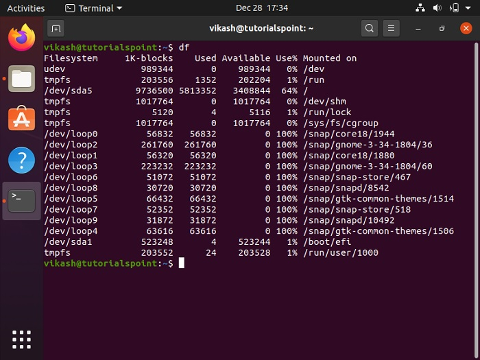 以下快照是在 Linux 系統中執行 df 命令後的輸出螢幕。