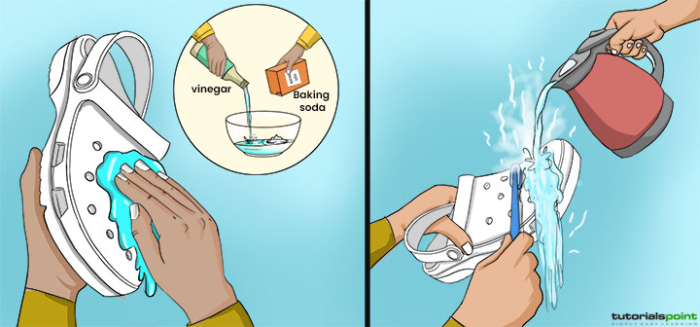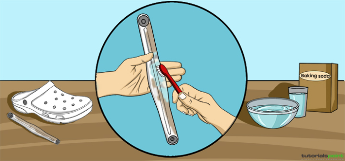 您應該將這種糊狀物塗抹在您的 Crocs 上,靜置約 15 分鐘,然後用刷子或牙刷擦掉。完成後,用溫水清洗鞋子,恢復其清新美觀。