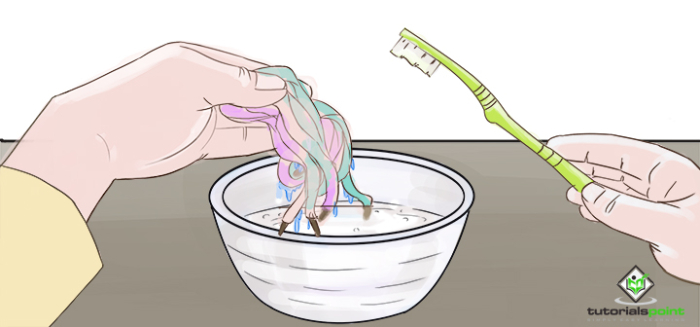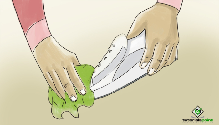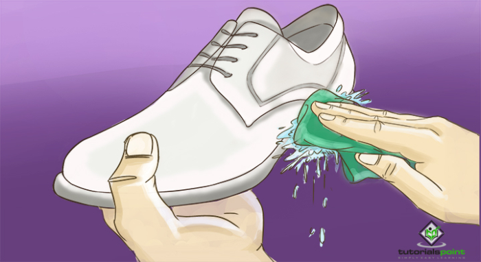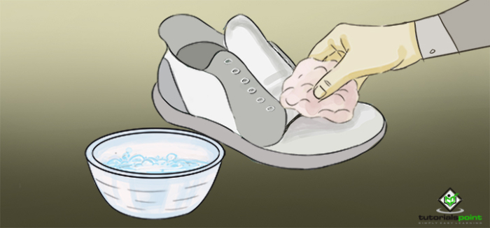 在一杯溫水中混合一茶匙洗潔精或清潔劑,製成肥皂水。將軟布或牙刷浸入溶液中,然後輕輕擦洗鞋子以去除汙漬。也清潔鞋子的內部,並用布吸乾多餘的水分。