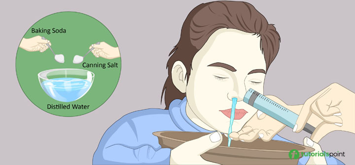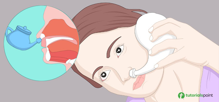 步驟 5 − 彎腰低頭,將溶液噴到一個鼻孔,確保溶液從一個鼻孔流入並從另一個鼻孔流出。如果一些溶液意外流入口中是正常的。吐出來,即使你吞了一點,也不會對你造成傷害。