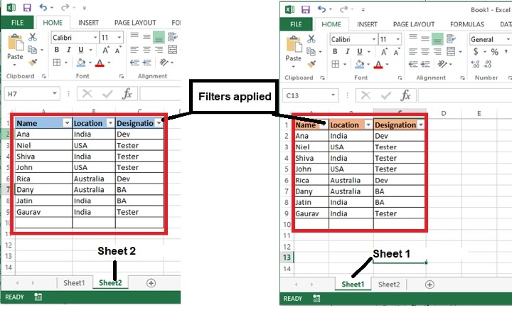 步驟 1:以下是包含兩個工作表(資料上已應用篩選器)的示例資料。