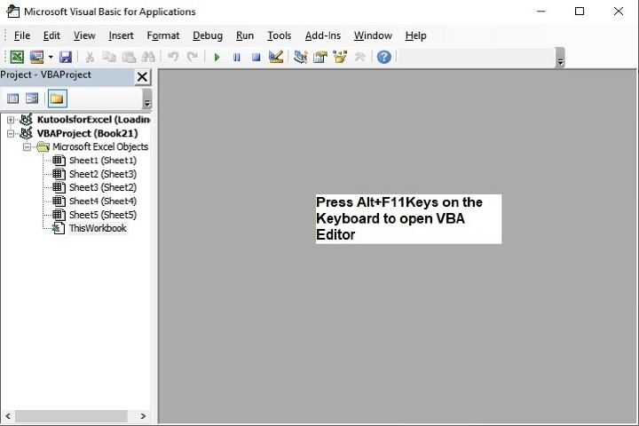 步驟 2:從鍵盤上按 Alt+F11 鍵,將開啟 Microsoft Visual Basic for Applications 視窗。