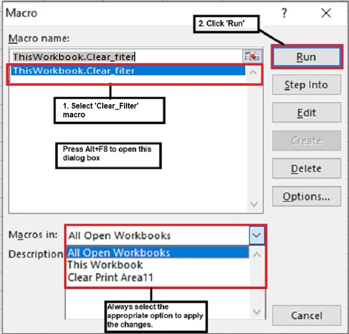 步驟 7:現在,返回檔案並按 Alt+F8,將開啟“宏”對話方塊,如下所示。