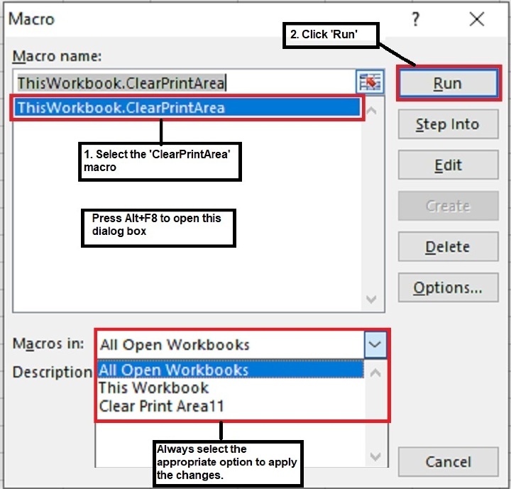 如果選擇“所有開啟的工作簿”,則將從所有開啟的 Excel 檔案中刪除列印區域。