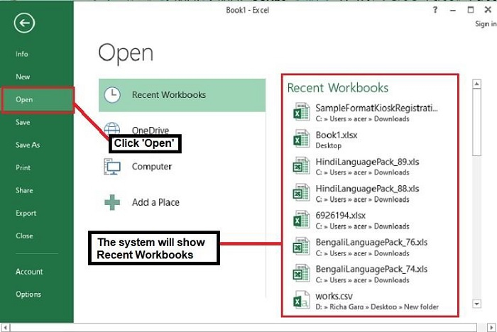單擊檔案 > 開啟,應用程式將顯示“最近的工作簿”窗格。