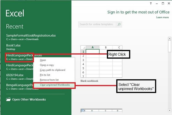 使用此選項,所有未固定的檔案都將一次性刪除。為此,在“最近”窗格中,右鍵單擊任何檔案並選擇清除未固定工作簿。