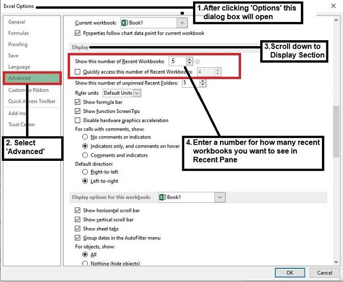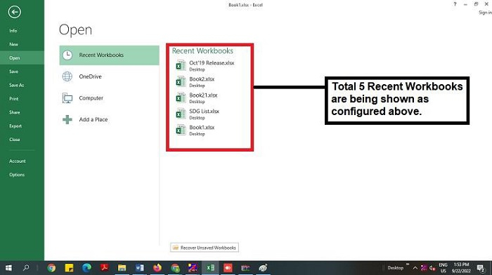 也可以透過更新Excel設定來使用“最近”窗格專案。您可以按照以下步驟更新“最近”窗格設定。