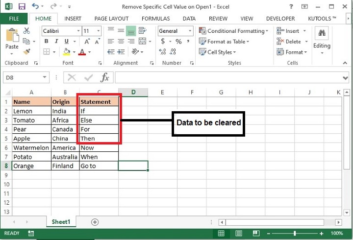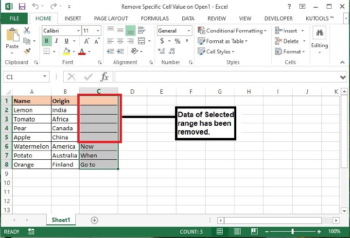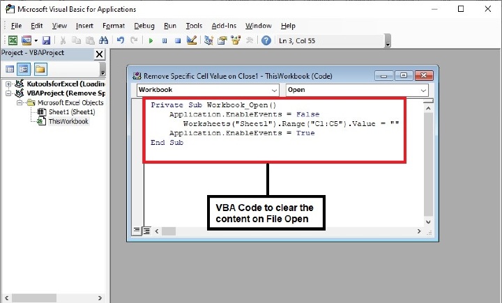 as ‘Sheet1’ and range of cells as ‘C1:C5’ whose data to be cleared when opening