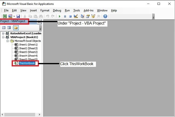步驟 4:在 Microsoft Visual Basic for Applications 視窗中,雙擊“專案”面板中可用的 ThisWorkbook。