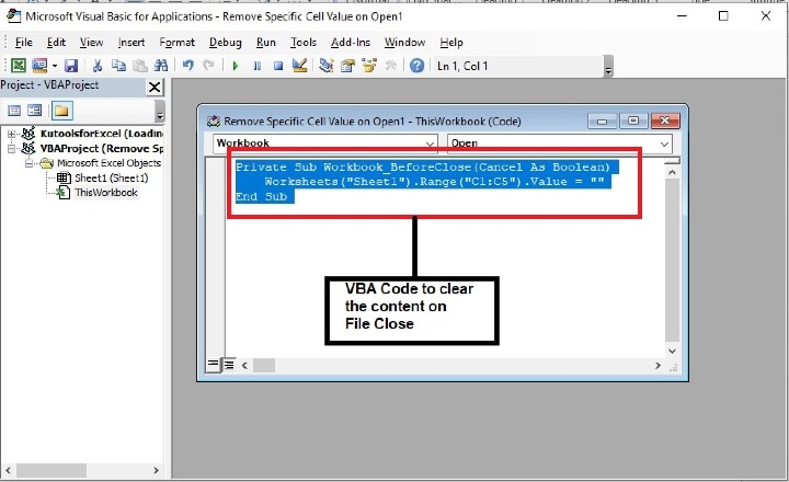 ‘Sheet1’ and range of cells as ‘C1:C5’ whose data to be cleared when closing the