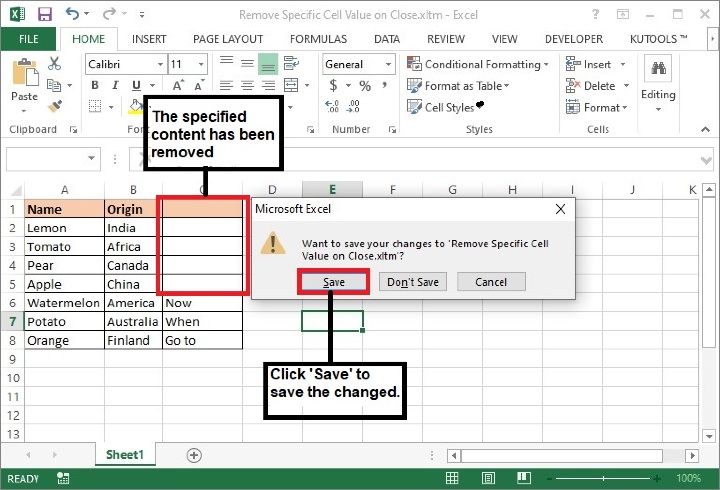 注意:在以上程式碼中,Sheet1 和 C1:C5 是將從中清除內容的工作表名稱和單元格區域。請根據需要更改它們。