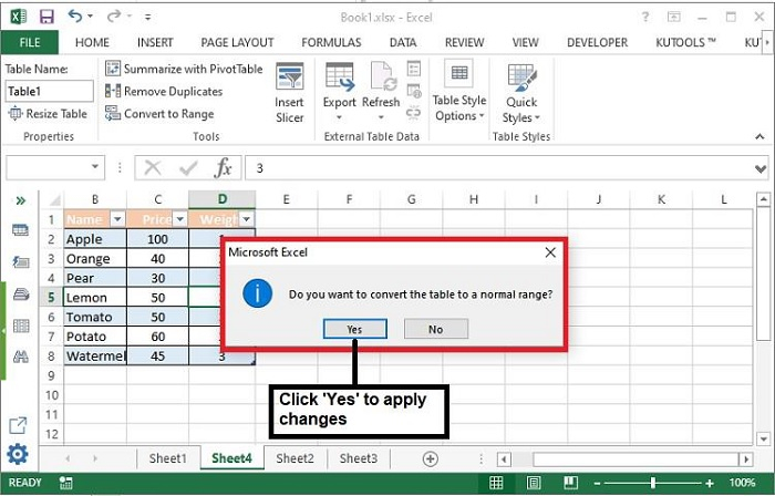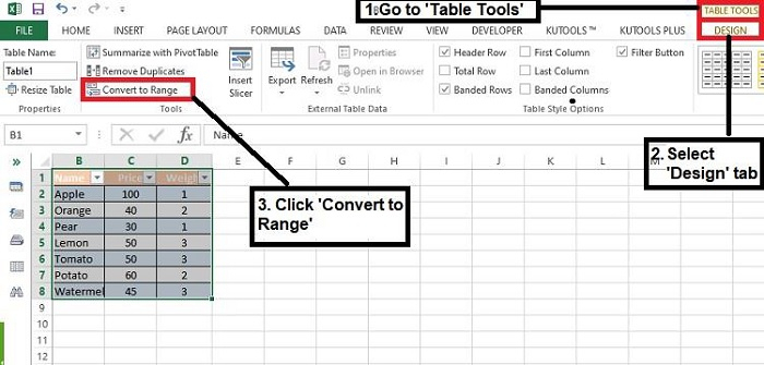 步驟2- 轉到“表格工具”>“工具”>“轉換為區域”。