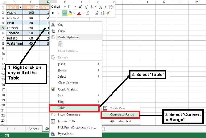 步驟3- 但是,您可以右鍵單擊表格的任何單元格以獲得“轉換為區域”選項。
