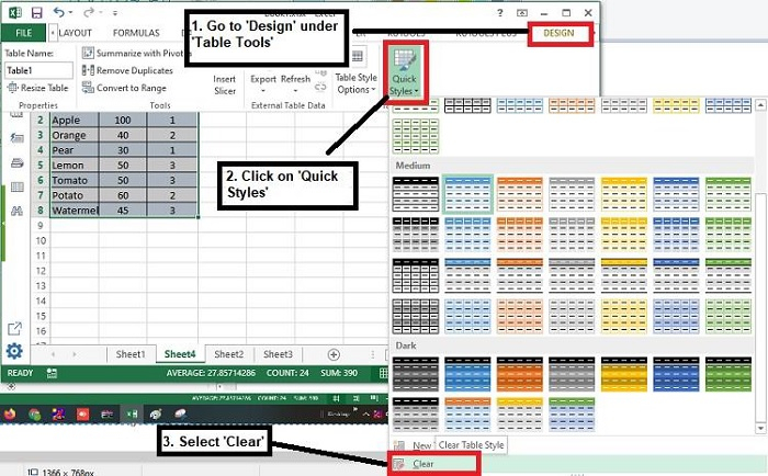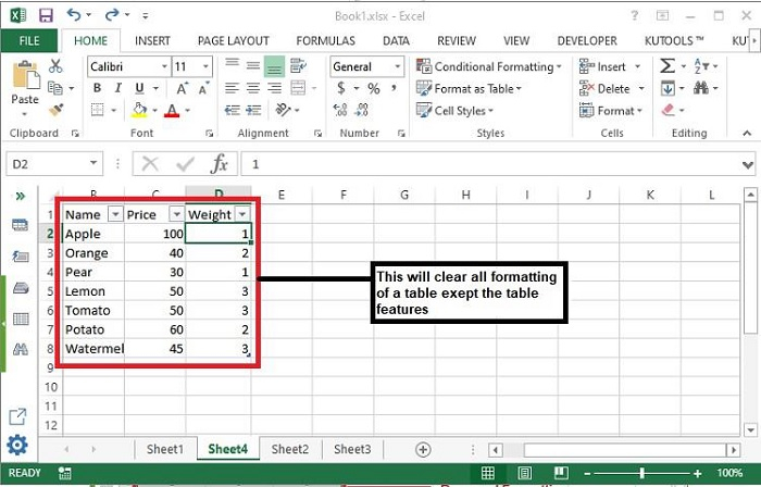 此功能將刪除所有格式和表格顏色,但保留表格的功能,而不會丟失表格資料。清除所有表格格式後,您仍然可以執行表格操作,例如篩選、資料驗證等。