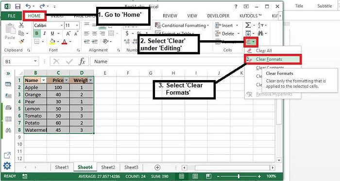 步驟1- 選擇表格區域,然後轉到“開始”>“編輯”>“清除”>“清除格式”。
