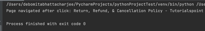 from selenium import webdriver driver = webdriver.Chrome(executable_path='../drivers/chromedriver') #url launch driver.get("https://tutorialspoint.tw/about/about_careers.htm") #identify link with partial link text l = driver.find_element_by_partial_link_text('Refund') #perform click l.click() print('Page navigated after click: ' + driver.title) #driver quit driver.quit()