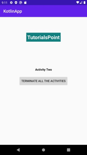 <?xml version="1.0" encoding="utf-8"?> <RelativeLayout xmlns:android="http://schemas.android.com/apk/res/android" android:layout_width="match_parent" android:layout_height="match_parent" android:padding="4dp"> <TextView android:layout_width="wrap_content" android:layout_height="wrap_content" android:layout_centerHorizontal="true" android:layout_marginTop="70dp" android:background="#008080" android:padding="5dp" android:text="TutorialsPoint" android:textColor="#fff" android:textSize="24sp" android:textStyle="bold" /> <TextView android:layout_width="match_parent" android:layout_height="wrap_content" android:layout_above="@id/terminateButton" android:layout_marginBottom="20dp" android:gravity="center" android:text="Activity Two" android:textColor="@android:color/background_dark" android:textStyle="bold" /> <Button android:id="@+id/terminateButton" android:layout_width="wrap_content" android:layout_height="wrap_content" android:layout_centerInParent="true" android:text="Terminate all the activities" /> </RelativeLayout>