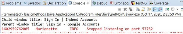 import org.openqa.selenium.By; import org.openqa.selenium.WebDriver; import org.openqa.selenium.WebElement; import org.openqa.selenium.chrome.ChromeDriver; import java.util.concurrent.TimeUnit; import java.util.List; import java.util.Set; import java.util.Iterator; public class CloseChildWindow { public static void main(String[] args) { System.setProperty("webdriver.chrome.driver", "C:\Users\ghs6kor\Desktop\Java\chromedriver.exe"); WebDriver driver = new ChromeDriver(); driver.get("https://secure.indeed.com/account/login"); //implicit wait driver.manage().timeouts().implicitlyWait(2, TimeUnit.SECONDS); driver.findElement(By.id("login-google-button")).click(); // window handles Set w = driver.getWindowHandles(); // window handles iterate Iterator t = w.iterator(); String ch = t.next(); String pw = t.next(); // switching child window driver.switchTo().window(ch); System.out.println("Child window title "+ driver.getTitle()); // close the child browser window driver.close(); // switching parent window driver.switchTo().window(pw); System.out.println("Parent window title: "+ driver.getTitle()); driver.quit();
