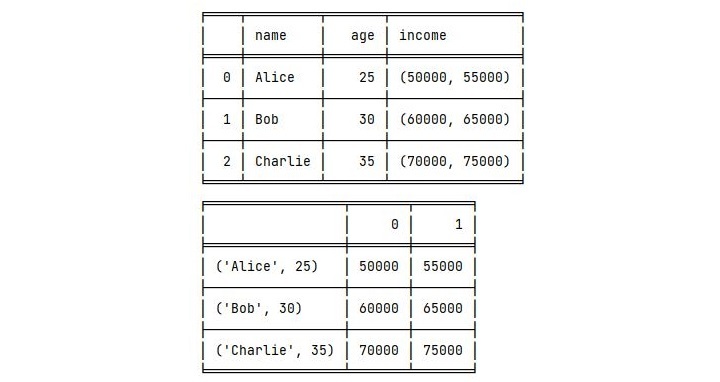import pandas as pd from tabulate import tabulate data = { 'name': ['Alice', 'Bob', 'Charlie'], 'age': [25, 30, 35], 'income': [(50000, 55000), (60000, 65000), (70000, 75000)] } df = pd.DataFrame(data) print(tabulate(df, headers='keys', tablefmt='fancy_grid')) df.set_index(['name', 'age'], inplace=True) stacked_df = df['income'].apply(pd.Series) print(tabulate(stacked_df, headers='keys', tablefmt='fancy_grid'))