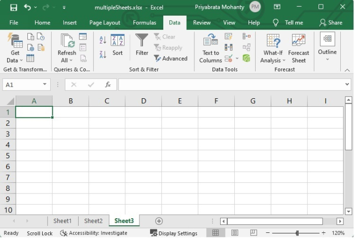 **步驟2 -** 要將Sheet1和Sheet2中的資料合併到Sheet3中,請選擇Sheet3的單元格“A1”。