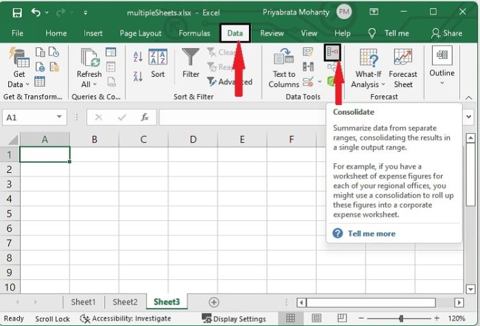 **步驟3 -** 單擊Sheet3的“資料”選項卡,然後單擊“資料工具”組中的“合併”選項。請參閱下圖以供參考。