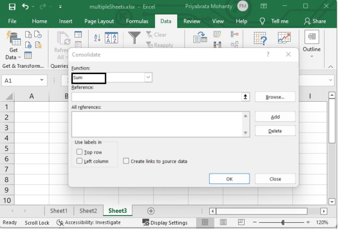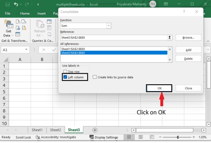 **步驟5 -** 在“引用”框中寫入源工作表名稱以及包含要合併到目標工作表(在本例中為Sheet3)中的資料的單元格範圍,如下圖所示。