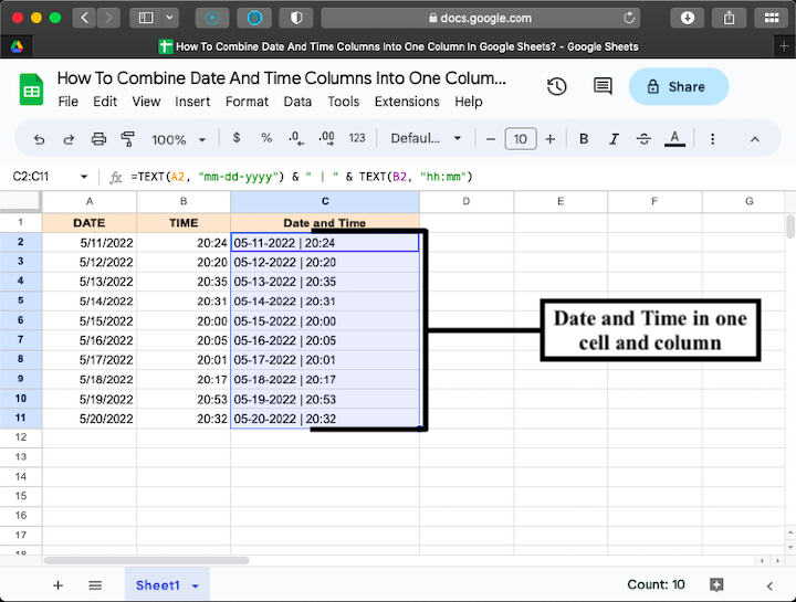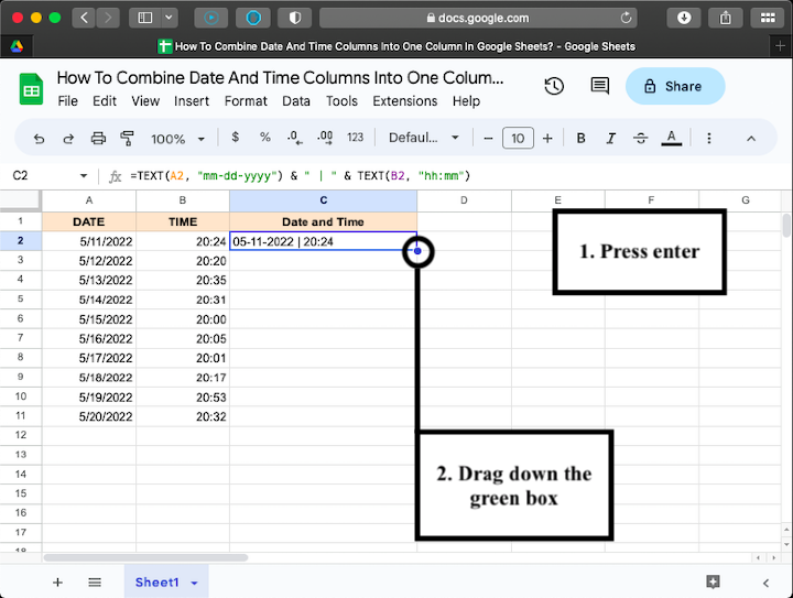 使用 TEXT 函式將日期和時間值合併到一個單元格中的 Google Sheets 公式:=TEXT(A2, "mm-dd-yyyy") & " | " & TEXT(B2, "hh:mm")