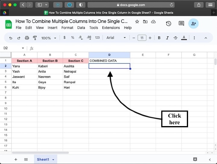步驟 2:在新列的第一個單元格中,輸入提到的公式以在一列中檢視不同列中的資料。