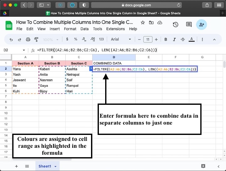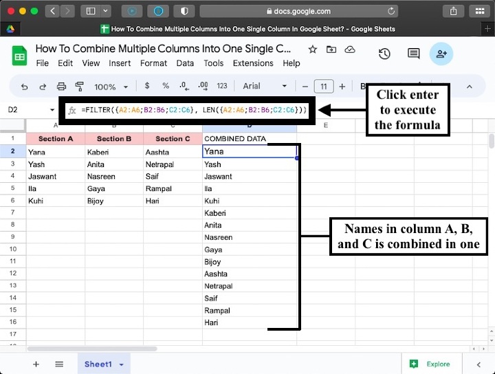 將 A、B 和 C 列中的資料合併到 D 列中的單個列表中的 Google 表格公式:=FILTER({A2:A6;B2:B6;C2:C6}, LEN({A2:A6;B2:B6;C2:C6}))