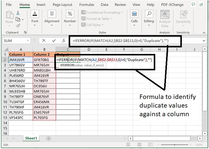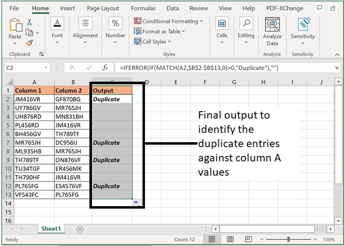 =IFERROR(IF(MATCH(A2,$B$2:$B$13,0)>0,"Duplicate"),"")