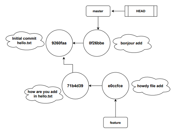 delI@DESKTOP-N961NR5 MINGW64 /e/tut_repo (master) $ git log −−oneline feature −−all −−graph * 0f26bbe (HEAD −> master) bonjour add |* eOccfce (feature) howdy file add |* 71b4d39 how are you added |/ * 9260faa hello. txt