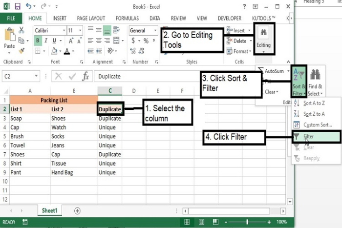 步驟 1 - 現在,選擇顯示重複值和唯一值的列,然後轉到“開始”選項卡 >“編輯工具” >“排序和篩選” >“篩選”。