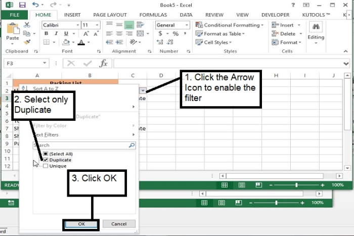 步驟 2 - 單擊“篩選”後,將在相應列中建立篩選器。現在單擊篩選器箭頭,然後僅選擇“重複”選項。然後單擊“確定”。