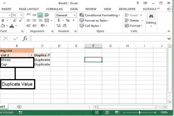 注意 - 在此樣本資料中,我們將列表 2 與列表 1 進行比較。對於在列表 2 和列表 1 中都存在哪些記錄,公式將顯示“重複”。