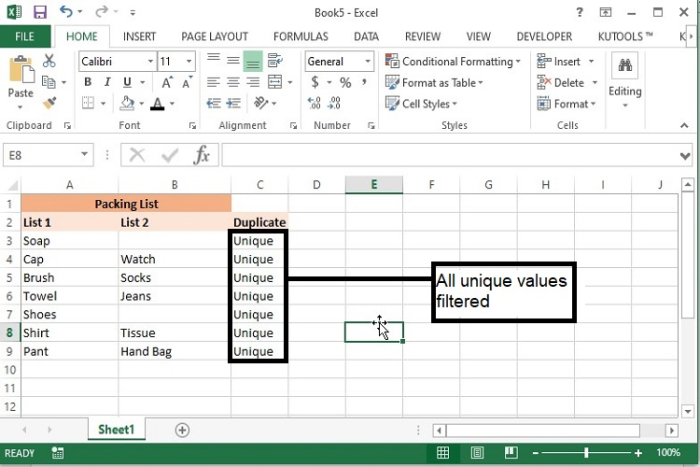 透過這種方式,可以將多個工作表與 1 個工作表進行比較,並可以從所有其他列表中刪除重複值。此方法有助於獲取整個資料中的唯一值。